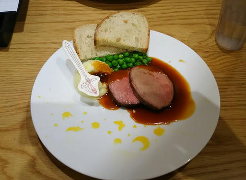 そして注文したメニューがこちら。おとぎの国の英国風ローストビーフ、ケロちゃんのマンゴーミルクフロート withスッピークッキー、小狼くんハッピーバースデーロールケーキです。