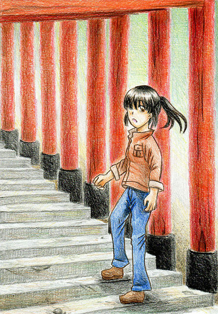 それぞれ「星」「花」、最後のは特にテーマを貰ったわけではないのですが、宿の露天風呂に行く為に外階段を上っていたら、友達に「はるさんってこういう階段に人物が佇んでる絵を描きそう」と言われたので描いてみました。背景は伏見稲荷大社風になりましたが。