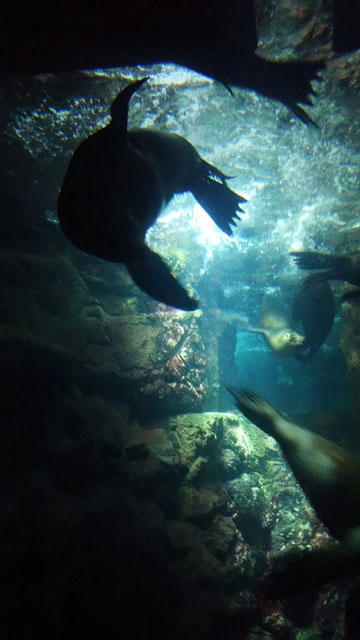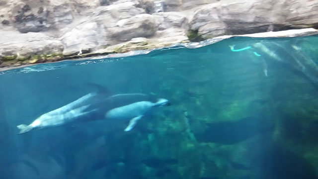 他の海の哺乳類達は順番待ちして見る事が出来ましたが、皆動きが早くてシャッターが追い付きませんでした。連写モードがあればもっと上手く撮れたのでしょうが、私のケータイには連写機能があるのかわからず、ブレブレの写真ばかりになってしまいました。