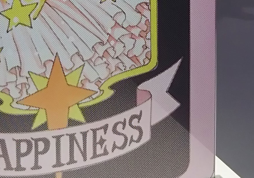 この真ん中に置かれているクリアカードは向こうが透けて見えるのに表と裏で絵柄が違うという紹介が書かれていてどうなっているのだろうと気になっていたのですが、近付いて見るとイラストに小さな穴がたくさん開いていて、離れて見ると絵も見えるし向こう側も見えるという仕組みになっていました。なるほどです。