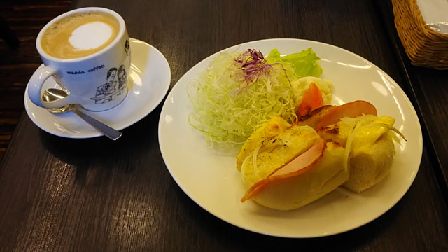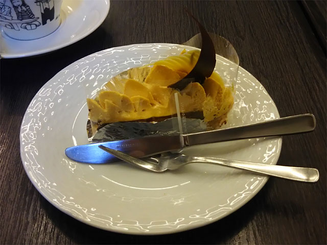 ミュシャ展を楽しんだ後は以前西尾維新大辞展でコラボドリンクを飲んで気に入った前田珈琲で昼食。今回もミュシャ展コラボスイーツがあって食べたかったのですが、サンドも食べるとしたらちょっと量が多いかなと断念・・・。代わりにチョコとキャラメルのケーキを注文しました。