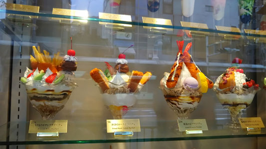 その後ブラブラ歩いている時に、あるカフェのウィンドウに驚きのパフェが並んでいました。